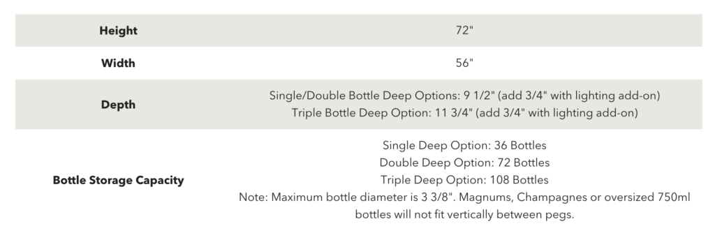 Accent Lighting** – Include standoff panels with LED perimeter lighting and undershelf lighting for the middle column of this display to really bring your wine wall to life! Everything you’ll need to add this effect is included with the “Accent Lighting” add-on: